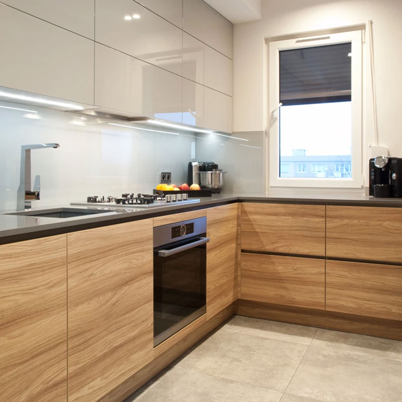 Most modular kitchens that we design have a unique sense of style and elegance to keep our clients overwhelmed by the entire range and variety of materials made available to them. With advanced technology, we now offer laminates that are processed with anti-fingerprint, anti-bacterial and fire retardant coating withthe same finishwhich looks both contemporary and elegant at the same time. Explore more with our in-house laminate collection!