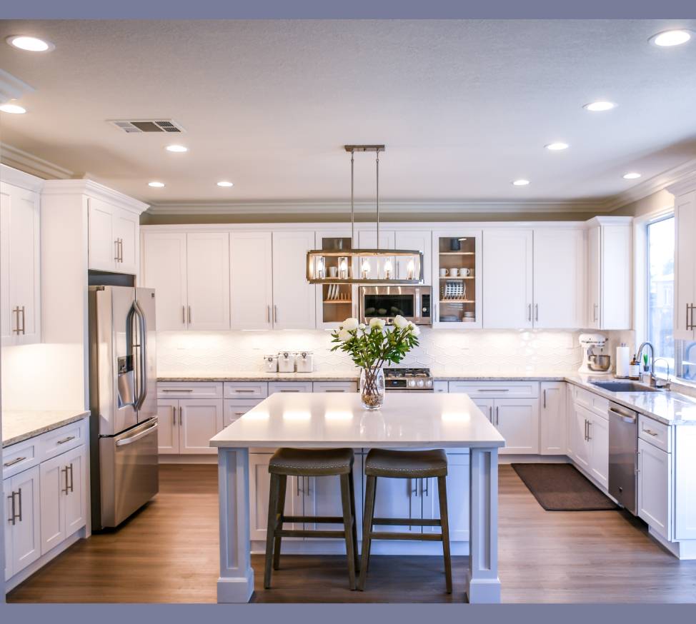 The U-shaped modular kitchen is designed in a way that it maximizes even a compact space available for the kitchen area. The design consists of smart space options which are accessible and practical keeping in mind the people who work in the kitchen. All the cabinets are designed in a way that everything is in reach, also the cabinets are closed which helps in keeping the space clean and tidy.